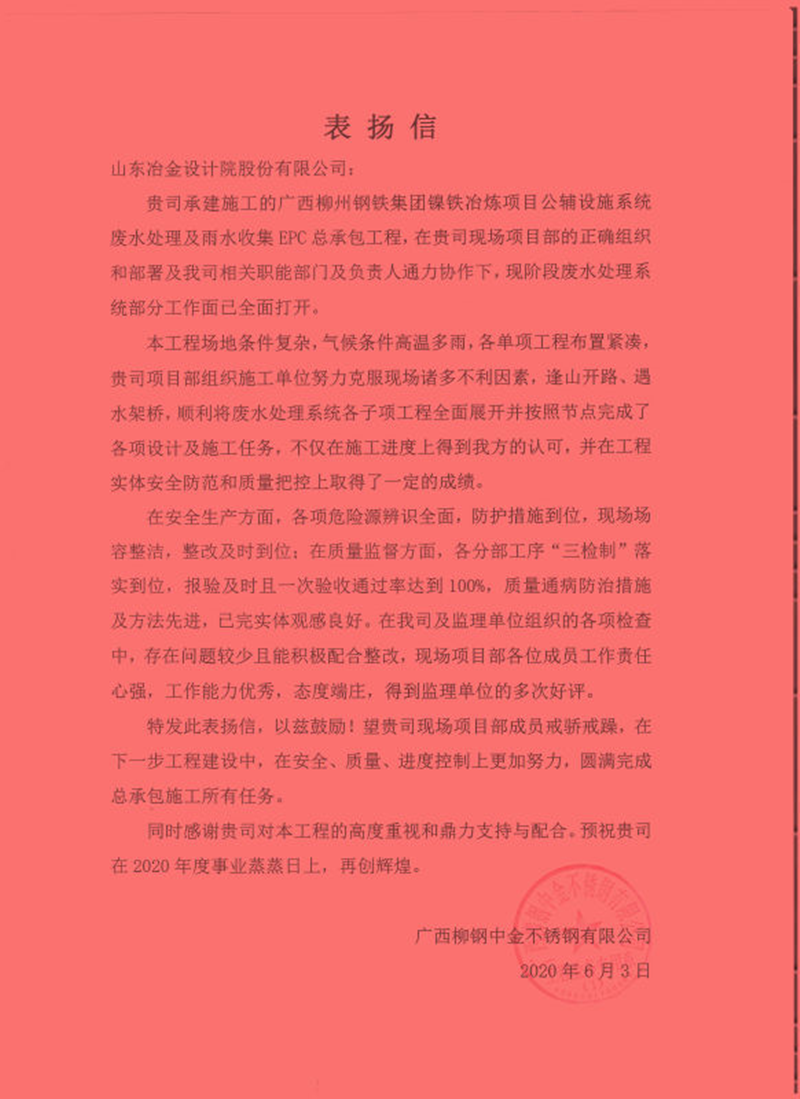 近日,公司總承包的廣西柳州鋼鐵集團鎳鐵冶煉項目公輔設施系統廢水處理及雨水收集工程項目部收到業主表揚信,稱贊項目部在安全、質量等各方面措施到位,在廣西鋼鐵廠的各項檢查中,存在問題較少且積極配合整改,對項目部全體成員的工作態度、工作能力給予了充分肯定。