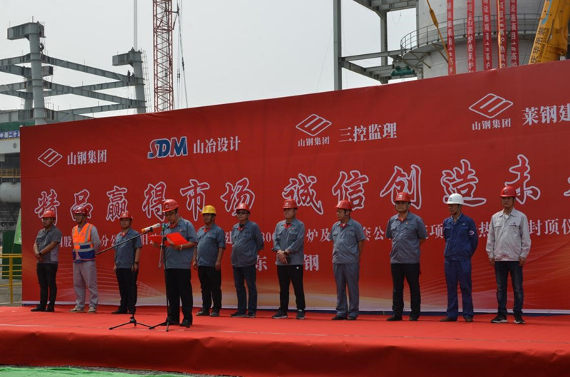 2020年6月28日9點(diǎn)50分,公司總包的山鋼股份萊蕪分公司新舊動(dòng)能轉(zhuǎn)換項(xiàng)目1號(hào)3800m3高爐熱風(fēng)爐順利封頂!山鋼股份萊蕪分公司新舊動(dòng)能轉(zhuǎn)換項(xiàng)目工程指揮部副指揮孫建設(shè),山鋼股份萊蕪分公司煉鐵廠經(jīng)理、高爐工程項(xiàng)目經(jīng)理部經(jīng)理張明,新舊動(dòng)能轉(zhuǎn)換項(xiàng)目工程指揮部高爐工程項(xiàng)目經(jīng)理部常務(wù)副經(jīng)理賈友劍,萊蕪三控冶金建設(shè)監(jiān)理事務(wù)所經(jīng)理沈桂聯(lián),我公司黨委書(shū)記、副總經(jīng)理谷卓奇,萊蕪鋼鐵集團(tuán)建筑安裝工程有限公司黨委書(shū)記、董事長(zhǎng)時(shí)元海,萊蕪鋼鐵集團(tuán)建筑安裝工程有限公司副經(jīng)理梁博,上海二十冶萊鋼高爐項(xiàng)目部項(xiàng)目經(jīng)理李虎,中國(guó)十九冶萊鋼高爐公輔項(xiàng)目部項(xiàng)目副經(jīng)理田澤龍,河北省安萊鋼高爐噴煤及鑄鐵機(jī)項(xiàng)目部項(xiàng)目經(jīng)理王紅帥,中十冶萊鋼主控樓項(xiàng)目部項(xiàng)目經(jīng)理馬少華出席了儀式。
