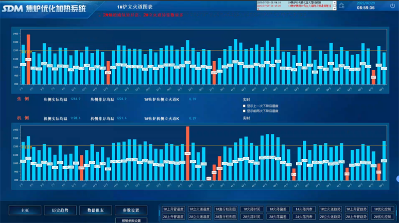 在煉焦環節,焦爐自動測溫和優化加熱系統成為節能降耗的“利器”。276個立火道紅外測溫點實時采集溫度數據,結合荒煤氣溫度與煙氣殘氧分析,系統自動調節煤氣流量與分煙道吸力,預計使加熱煤氣消耗降低2.8%,全爐溫度均勻系數提升至0.92。通過火落時間預測與標準溫度動態優化,顯著減小結焦時間偏差,大幅減少了能源浪費。